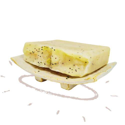 Rice Milk, Chamomile Tea, Saponified oils of Olive, Coconut, Shea butter, Canola, and Castor, (Sodium Olivate, Sodium Cocoate, Sodium Shea Butterate, Sodium Canolate, Sodium Castorate) Glycerin, Rock Salt. Essential oils of Chamomile and Lavender. Topping of poppy seeds.